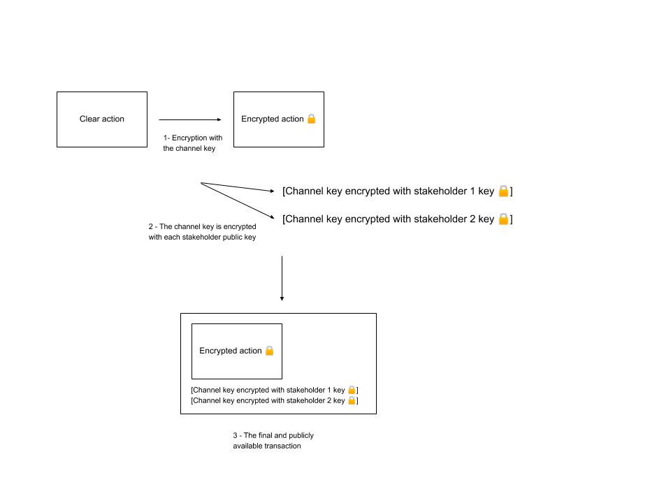 Transactions can also be encrypted, such that only stakeholders of the request can read them. Any number of stakeholders can be included in the creation of an encrypted request. Request uses an encryption scheme nearly identical to [HTTPS](https://www.freecodecamp.org/news/https-explained-with-carrier-pigeons-7029d2193351/). It uses a symmetric key (usually referred to as the "channel key") to encrypt and decrypt the transaction channel content, and asymmetric keys to encrypt and decrypt copies of the symmetric key.