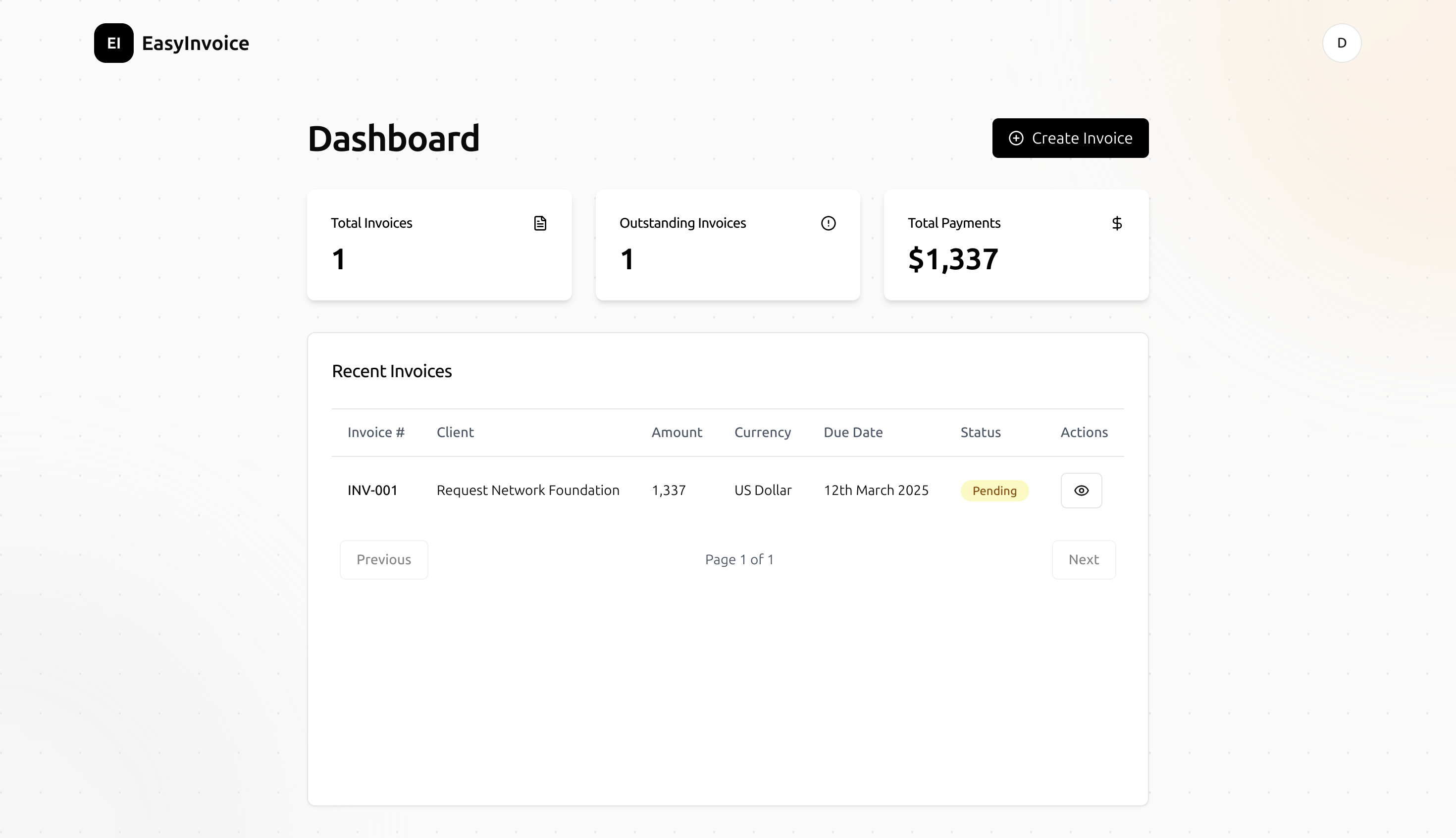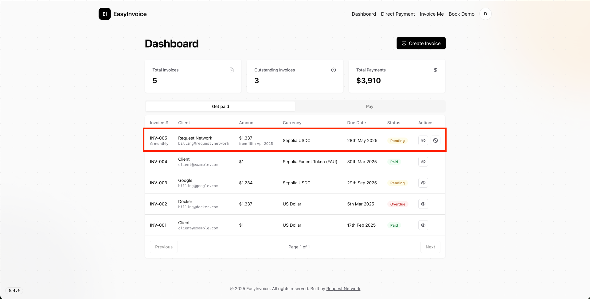 * **Real-time Updates**: The app receives webhooks from the Request Network API to update the invoice status in real-time.