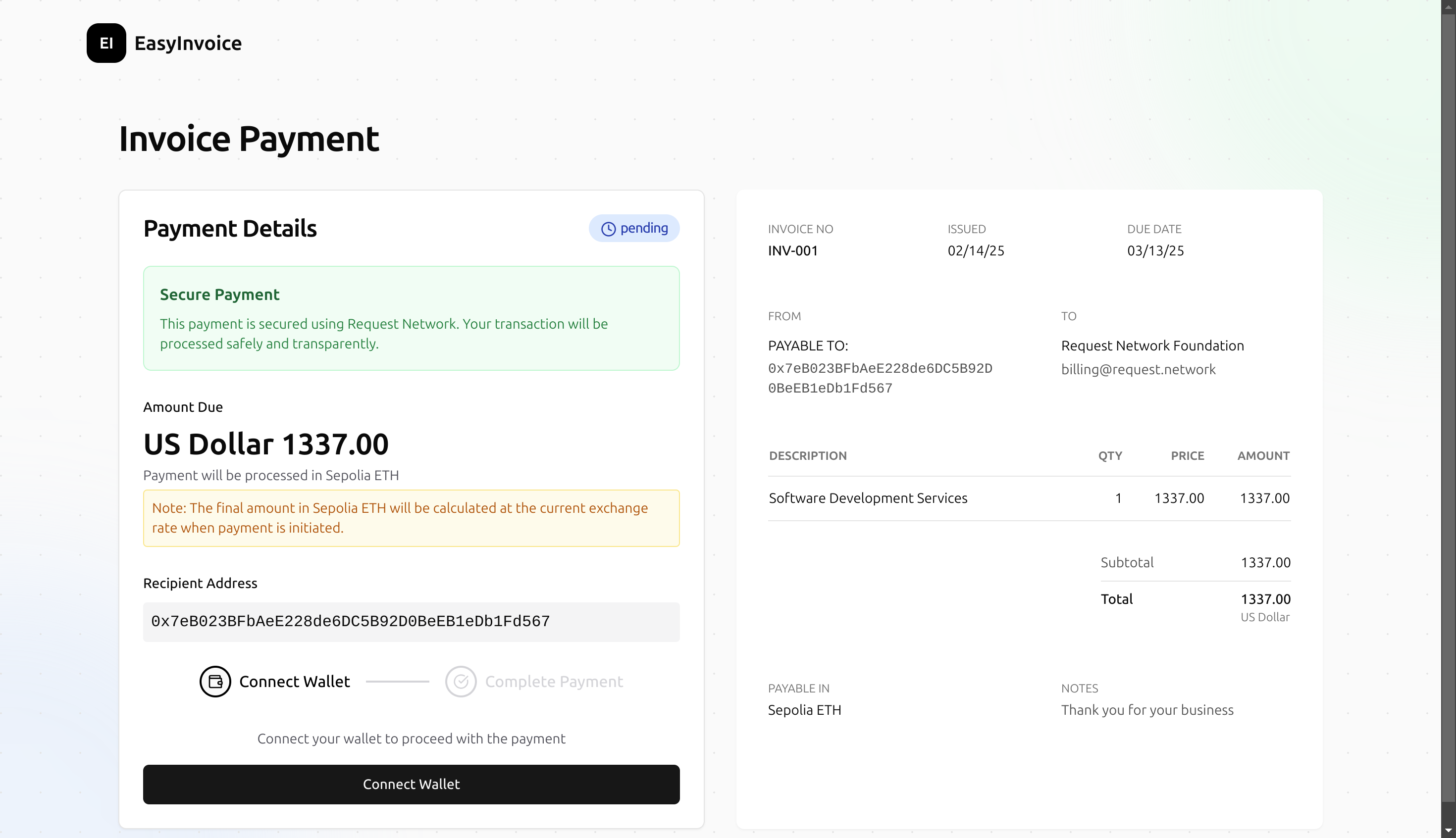 * View invoice details and initiate payment using transaction calldata provided by the Request Network API.