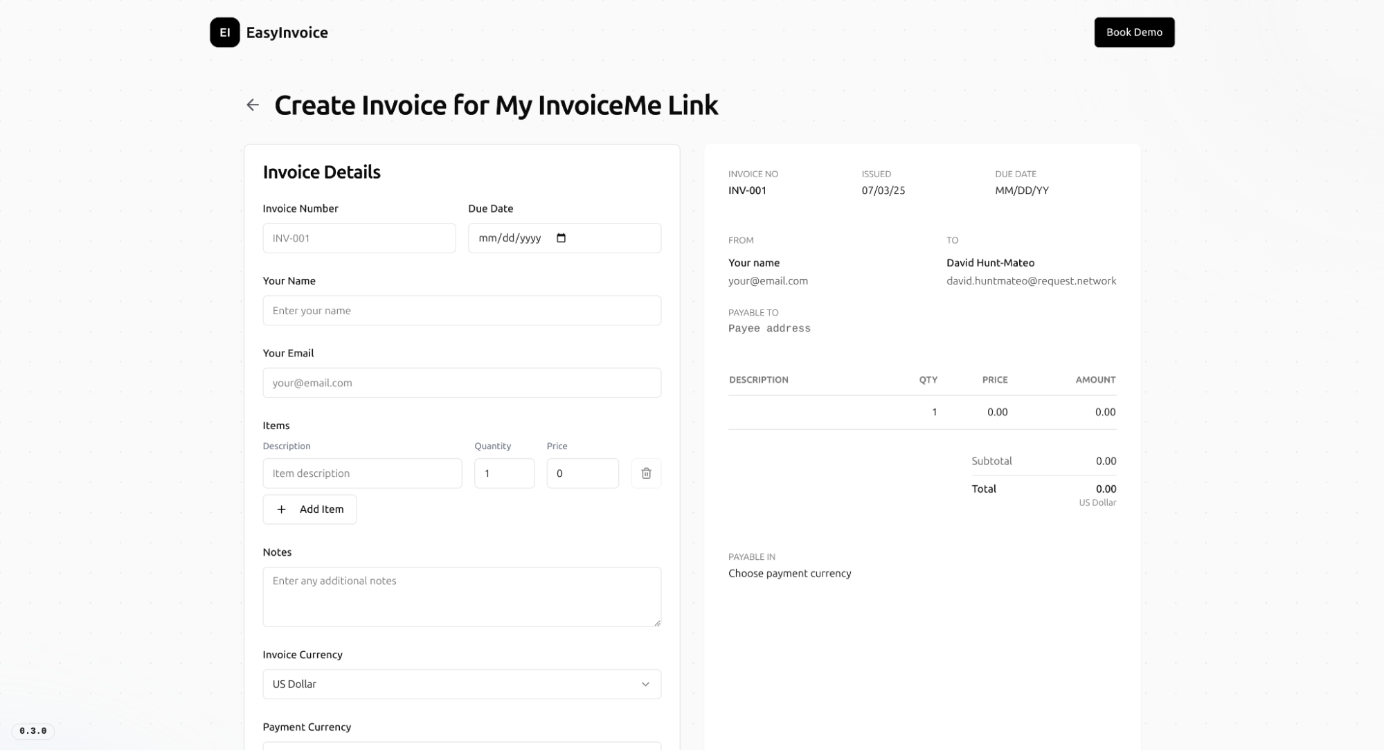* Invoice currency and payment currency options, supporting currency conversion via the Request Network API.