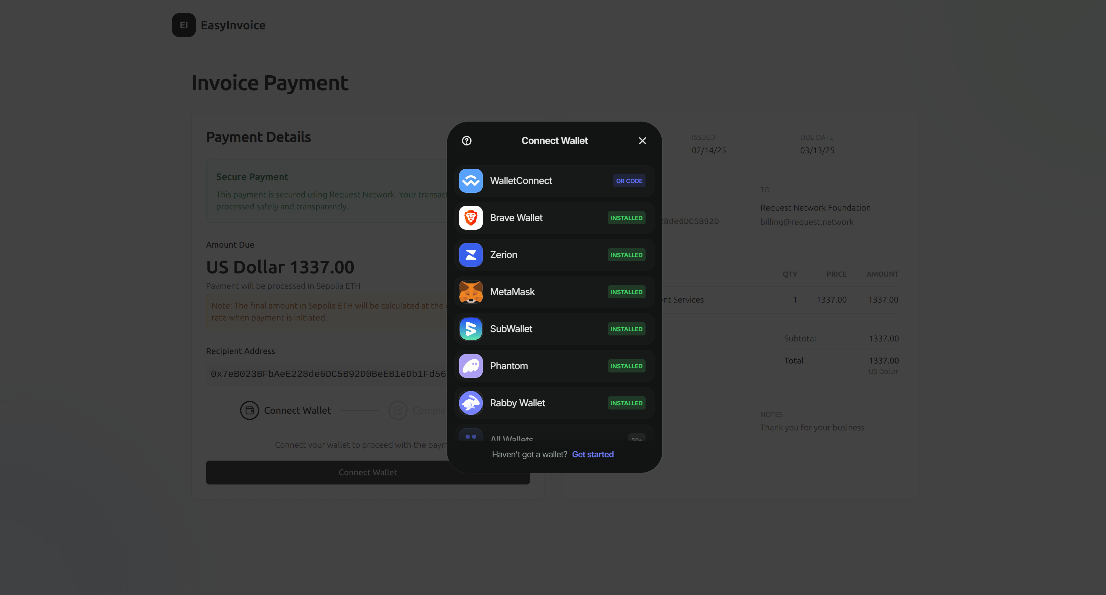 <figure><img src="https://1914277788-files.gitbook.io/~/files/v0/b/gitbook-x-prod.appspot.com/o/spaces%2Fei6UAiSK3iAAi0mFH667%2Fuploads%2Fgit-blob-aa6eba6e357825684e36735b00922664fc6c43bd%2Fimage%20(1).png?alt=media" alt=""><figcaption><p>EasyInvoice supports 80+ wallets via Reown AppKit</p></figcaption></figure>