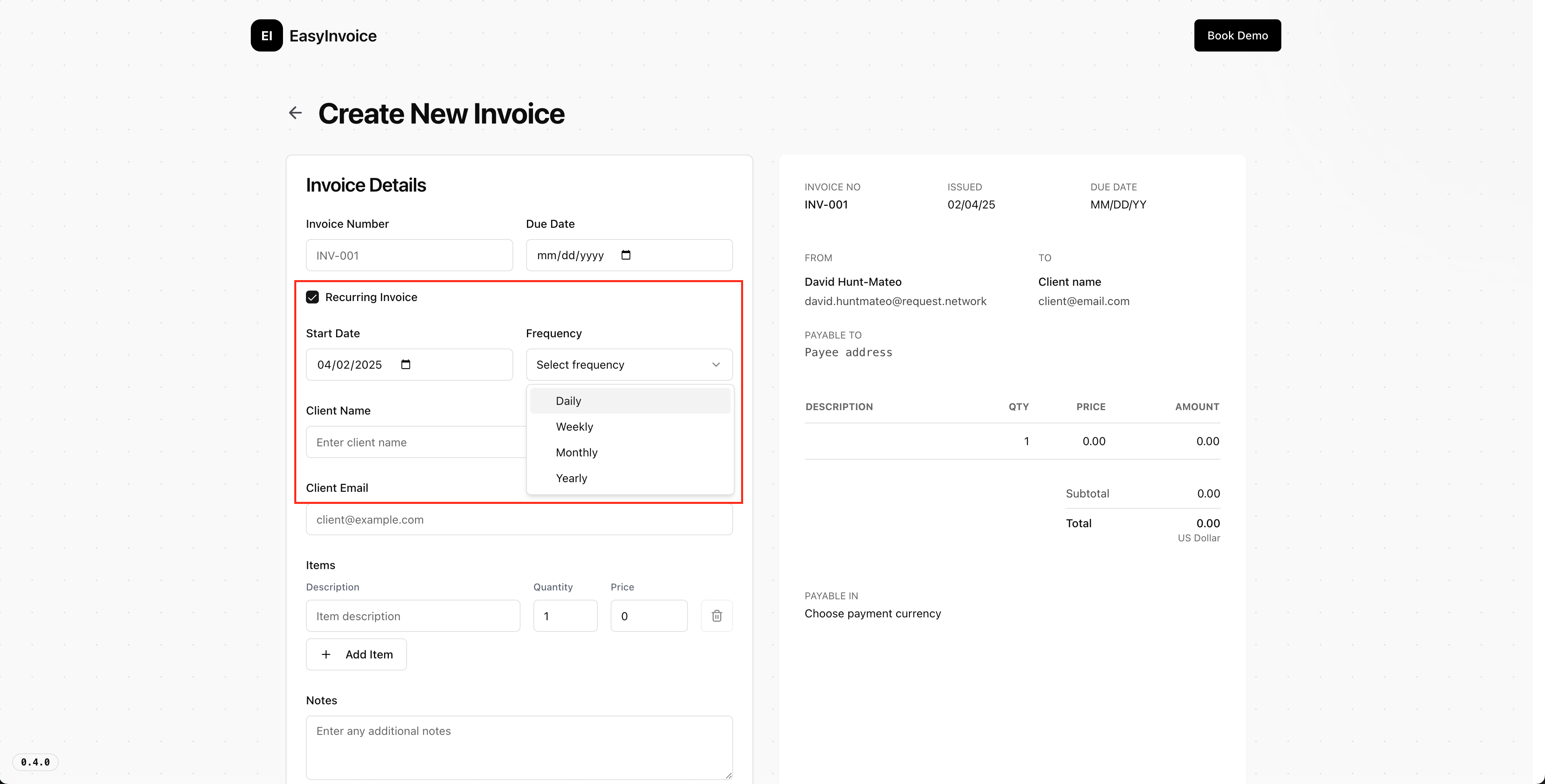 * **Recurring Invoice**: Automatically create new invoices based on the selected start date and frequency